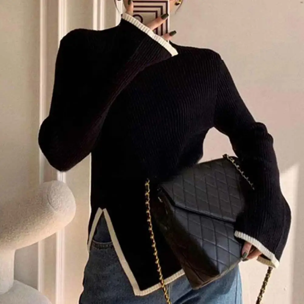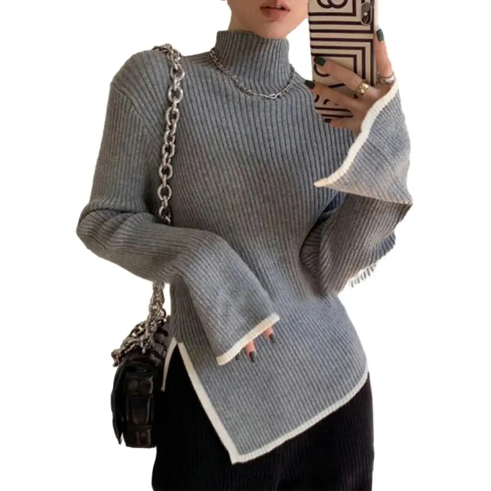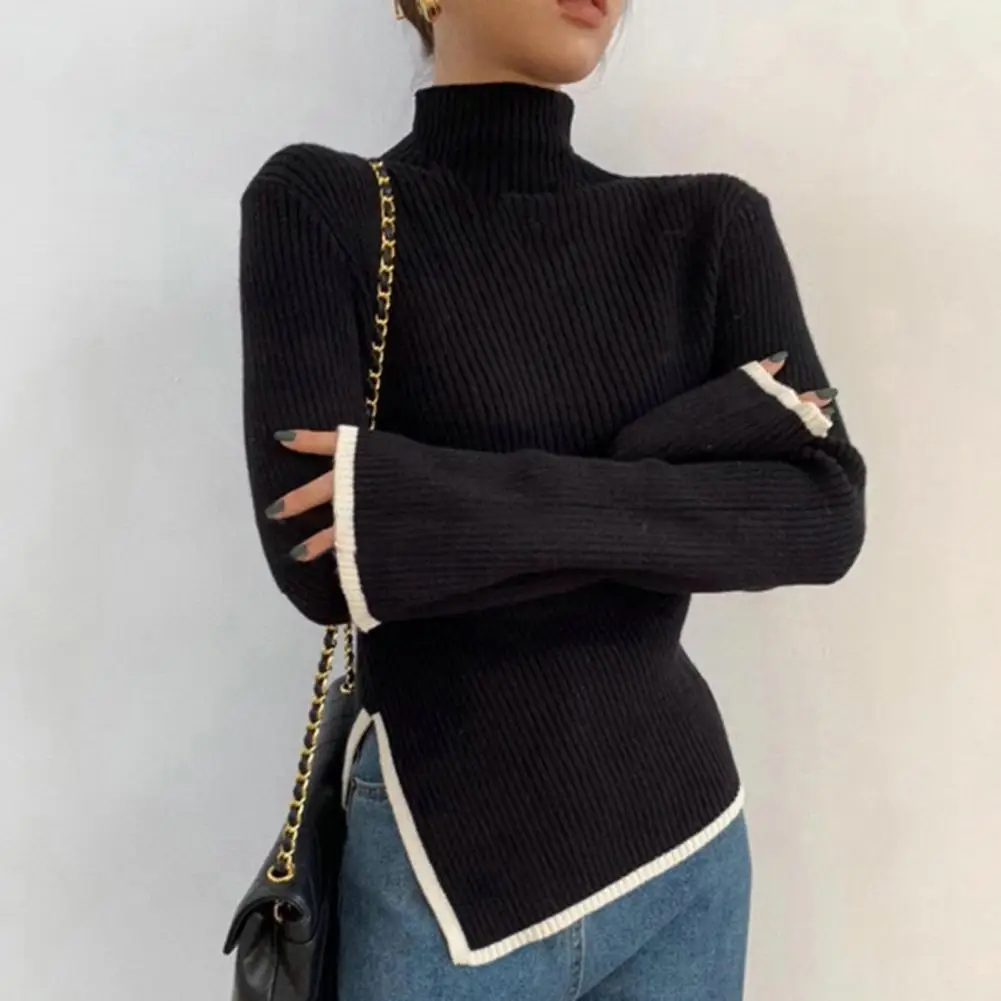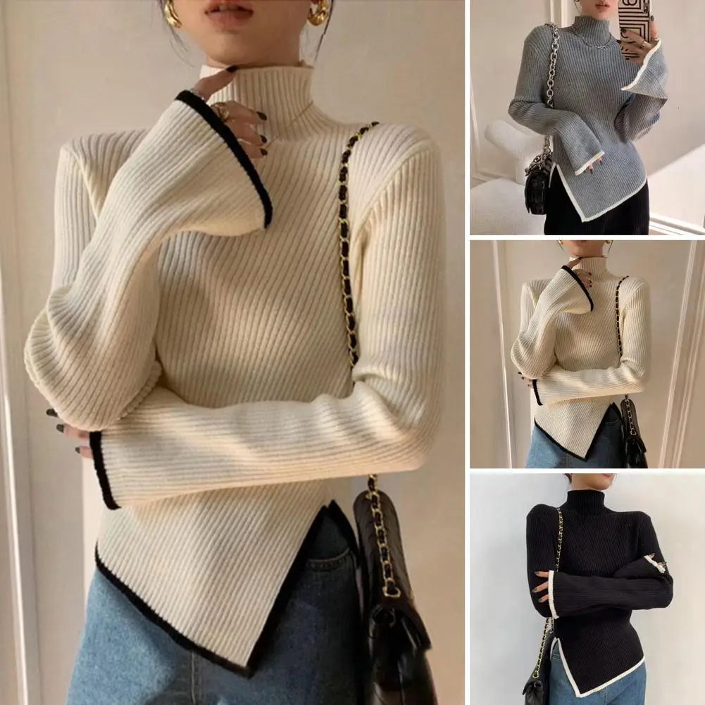 Women Fall Winter Sweater High Collar Neck Protection Knitted Irregular Split Hem Solid Color Long Sleeve Elastic Soft Warm Pullover Lady Top